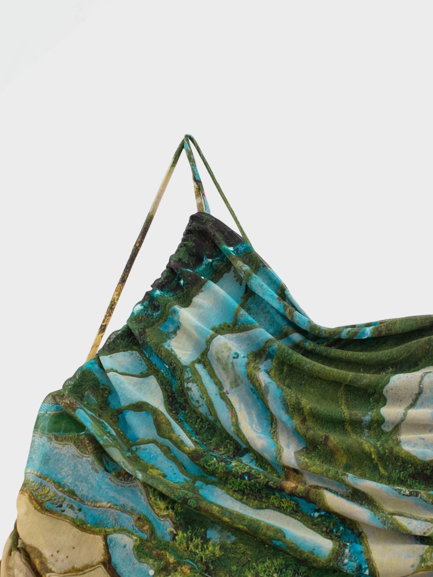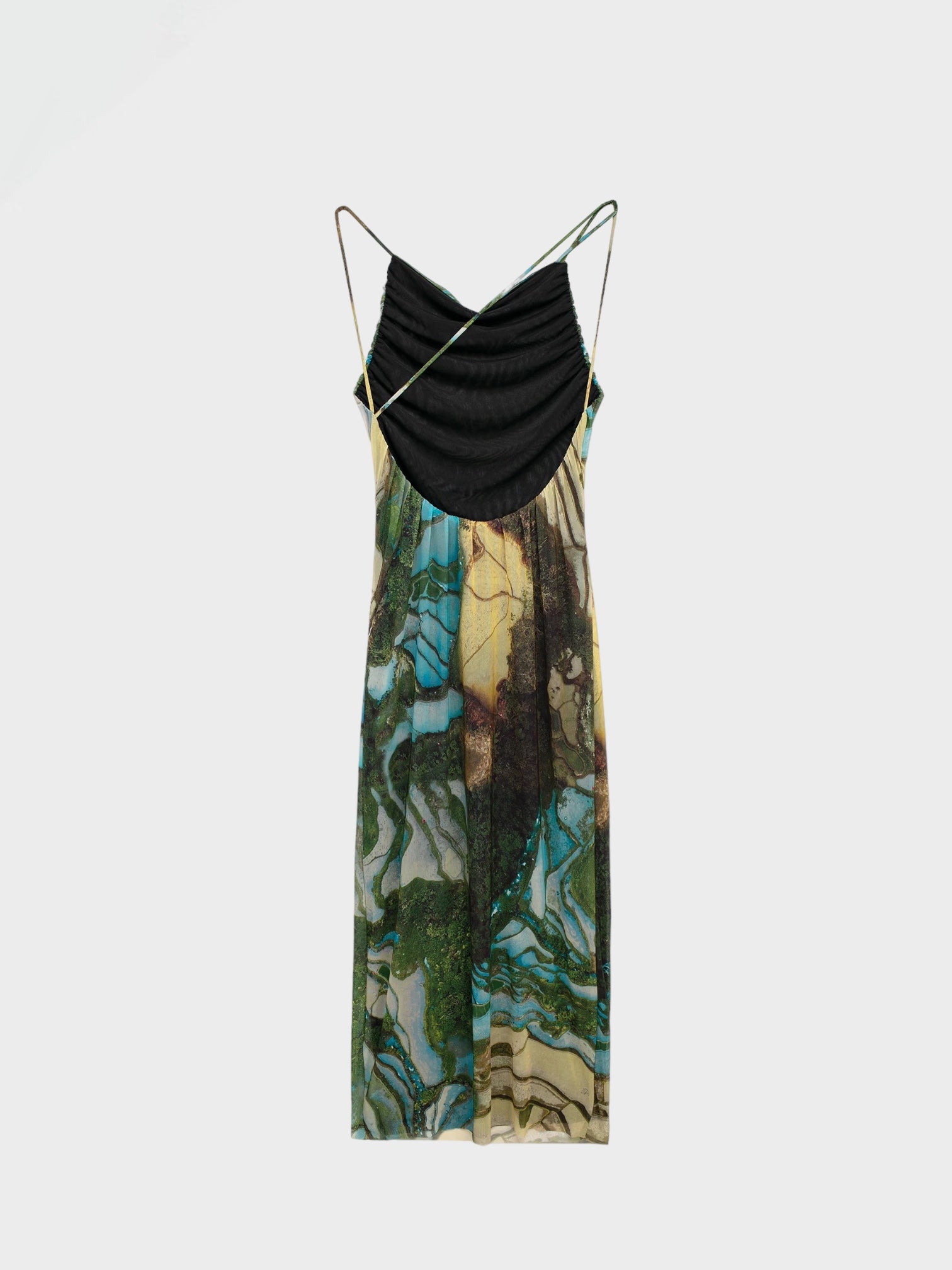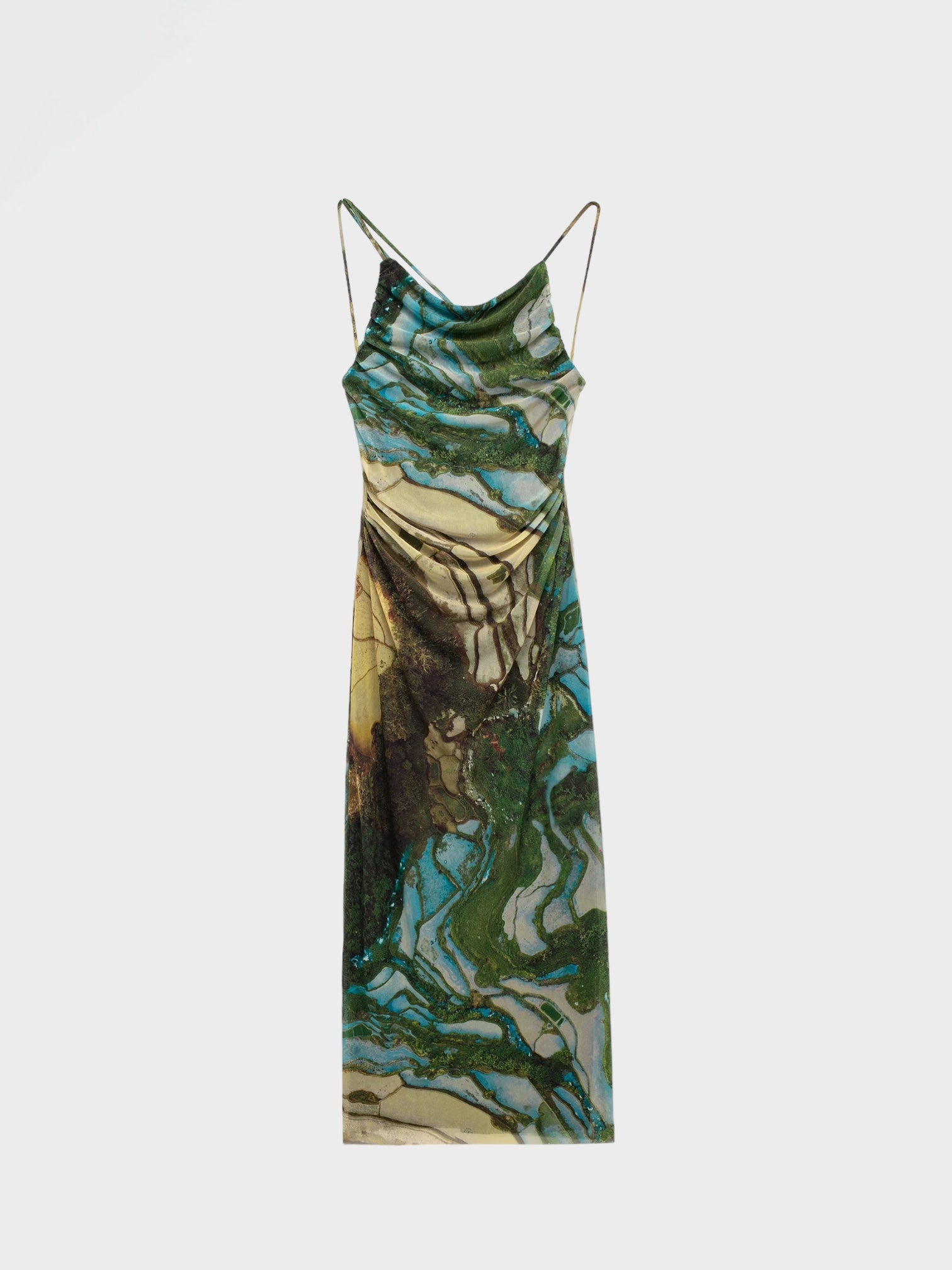 The dress of your spring season is signed Lucas Giordani. Let yourself be transported to the Seventies atmosphere of this model with soft lines characterized by marbled design.