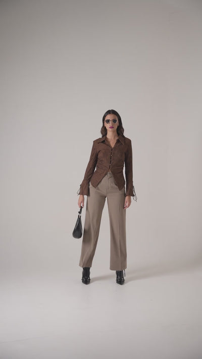 Le raffinement et le style fusionnent dans cet élégant chemisier en coton. Il a un collier pointu et une boucle délicate à l'avant, ce qui ajoute une touche de féminité et d'originalité. Les manches défectueuses, avec leur mouvement fluide, ajoutent une touche de dynamisme à votre look. Les lacets croisés élégants sur les poignets créent un effet chic et intrigant. Portez-le pour une occasion spéciale ou pour ajouter une touche de glamour à votre journal.